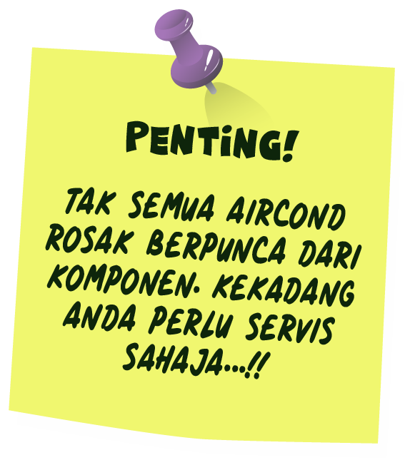 Kami menasihati anda agar segera servis aircond. Bayangkan jika aircond anda sudah rosak, anda terpaksa membelanjakan wang yang banyak untuk kos baik pulih. Sedangkan kos servis tidak lah mahal. Silap hari bulan, aircond terpaksa ditukar baru. Aircond wajib di servis berkala supaya ia tahan lebih lama. Aircond yang tidak diservis juga akan menggunakan tenaga elektrik yang banyak. Nasihat kami sila servis aircond anda sekarang sebelum masalah bertambah rumit !!